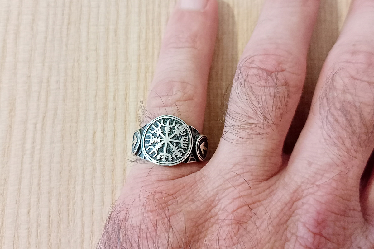 Кольцо с руническим компасом Вегвизир и рунами Тейваз (Тюр) - Путь Воина